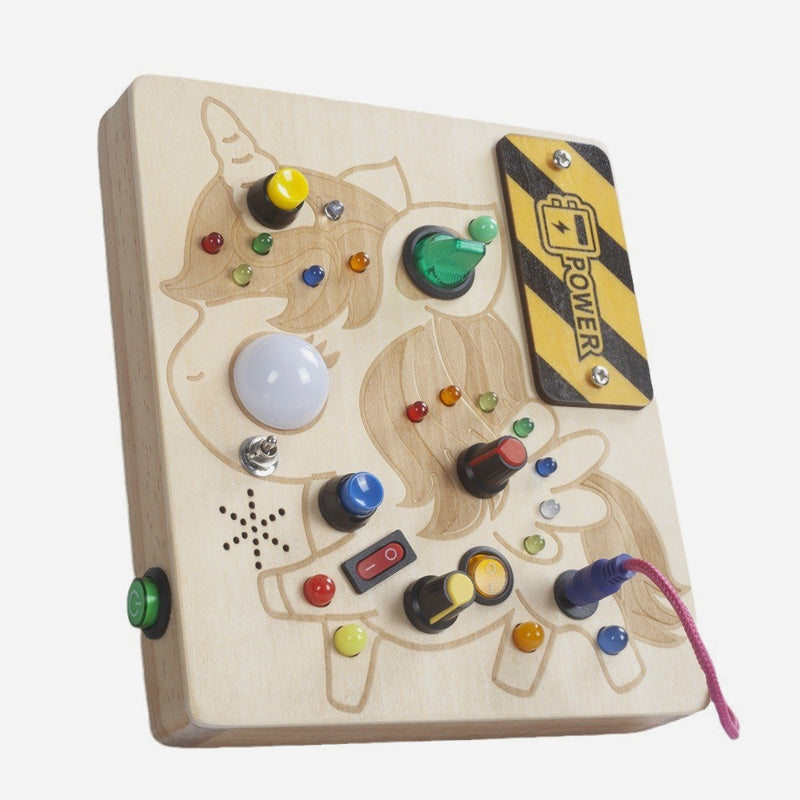 Utarbetad design - Den här upptagna brädan är gjord speciellt för små barn som gillar att leka med strömbrytare och LED-lampor. På denna upptagna bräda finns det 10 separata strömbrytare, och varje strömbrytare relaterar till en annan färg eller stil av LED-ljus. Varje lysdiods ljusstyrka är inställd för att vara precis rätt för barnet - inte för ljust, bländande eller mörkt för att se bra. En huvudströmbrytare är inställd för att stänga av alla LED-lampor med ett klick för att undvika slöseri med kraft.