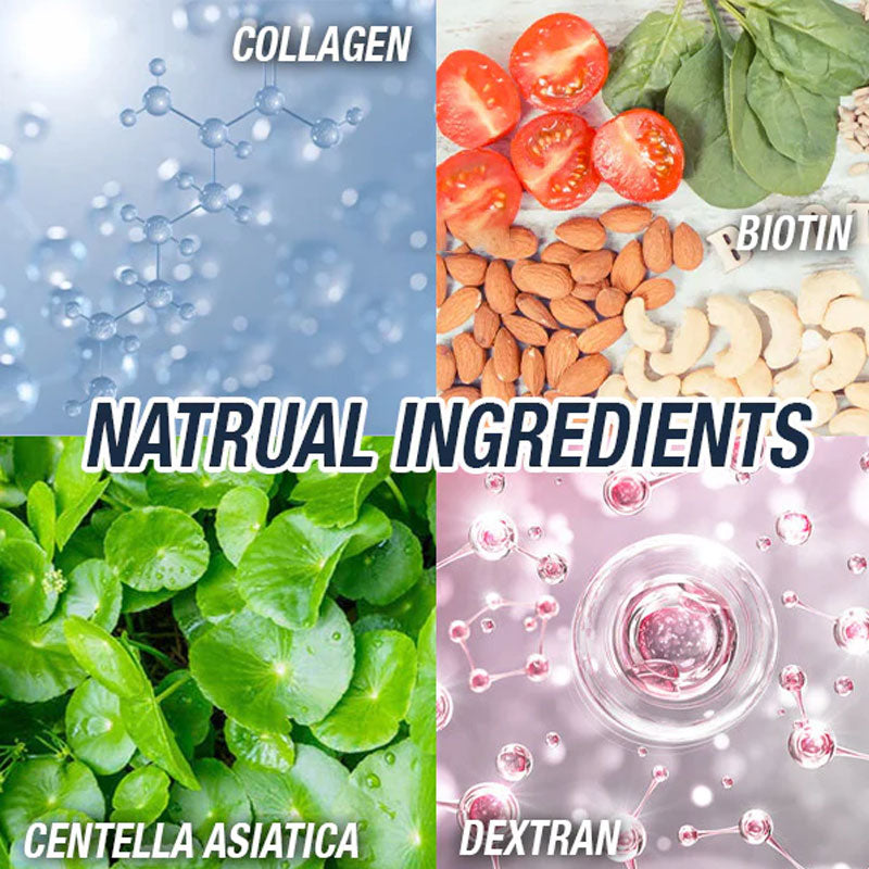 Kollagen - Ett viktigt strukturprotein som har flera positiva effekter på både nageltillväxt och nagelförstärkning. Det fungerar som ett kraftfullt ”lim” som binder keratincellerna samman, ett starkt, fibröst skleroprotein som är känt för sina strukturella och skyddande egenskaper. Det är viktigt för att hålla naglarna elastiska och friska och förhindra att de blir spröda eller går sönder lätt. Dessutom främjar kollagen nageltillväxt och förbättrar fuktbalansen, vilket är viktigt för att förhindra torrhet.