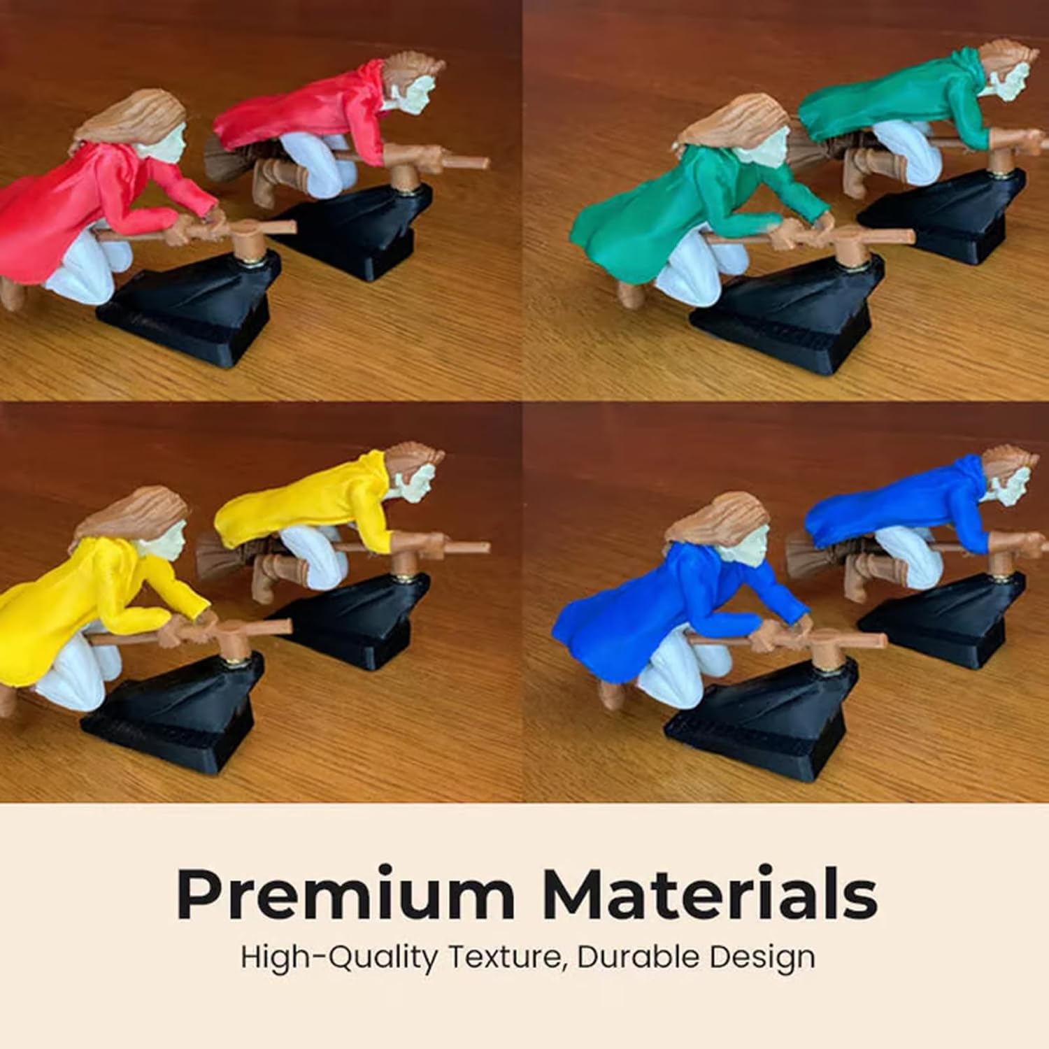 Bring the magic of flying on a broomstick right to your dashboard! This 3D-printed miniature wizard or witch spins and sways naturally as you drive around corners, making it look like they're floating through the air above your dashboard. Choose the gender of your rider and show your house pride with one of four classic house colors. Perfect for fans of fantasy and unique car decoration!